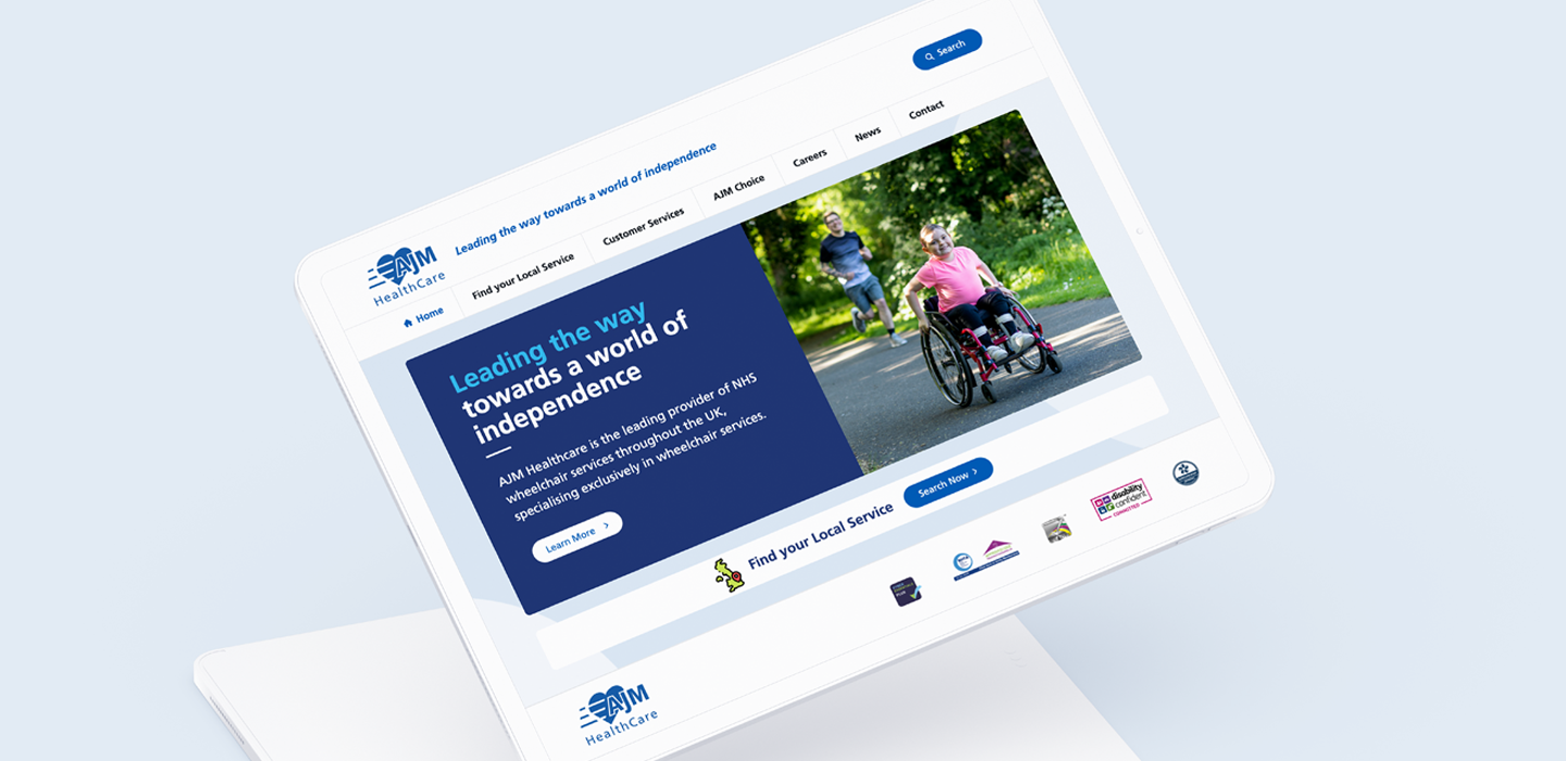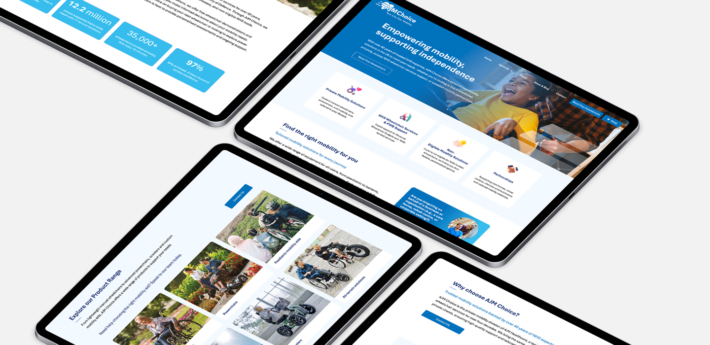 AJM Healthcare is a leading UK provider of NHS wheelchair services. Through its AJM Choice brand, it also offers private mobility products, custom solutions and accessories. The project involved revamping the NHS services website and creating a new Private Pay website and building a comprehensive e-commerce Shopify website at shop.ajmchoice.com.